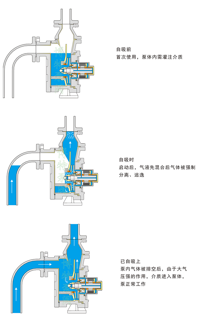 ZMD系列自吸式磁力泵,充分結(jié)合了磁力泵和自吸泵的優(yōu)點,既具有自吸功能,又取消了軸封,利用磁力耦合間接傳動,完全消除了滴漏的現(xiàn)象。