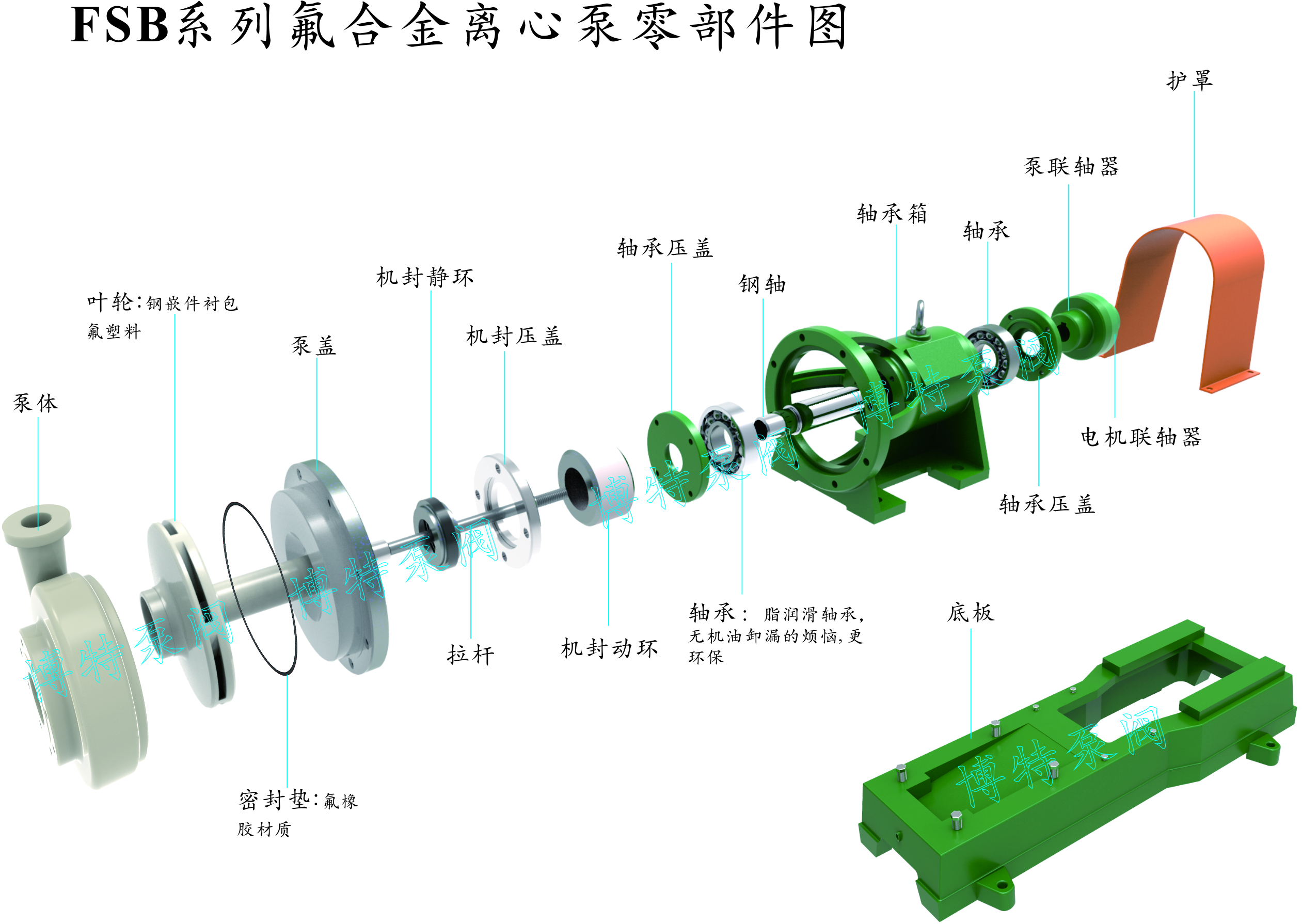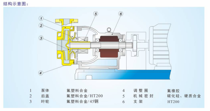 單級單吸懸臂式離心泵,過流部件采用純凈的氟塑料合金制成,無雜質(zhì)析出,十分適用于輸送高純度的化學介質(zhì)。泵的承重部分為金屬材料。配置外裝式波紋管機械密封,對磨材質(zhì):氧化鋁VS四氟、碳化硅VS四氟、硬質(zhì)合金VS硬質(zhì)合金,用戶可按要求自行選擇對磨付。